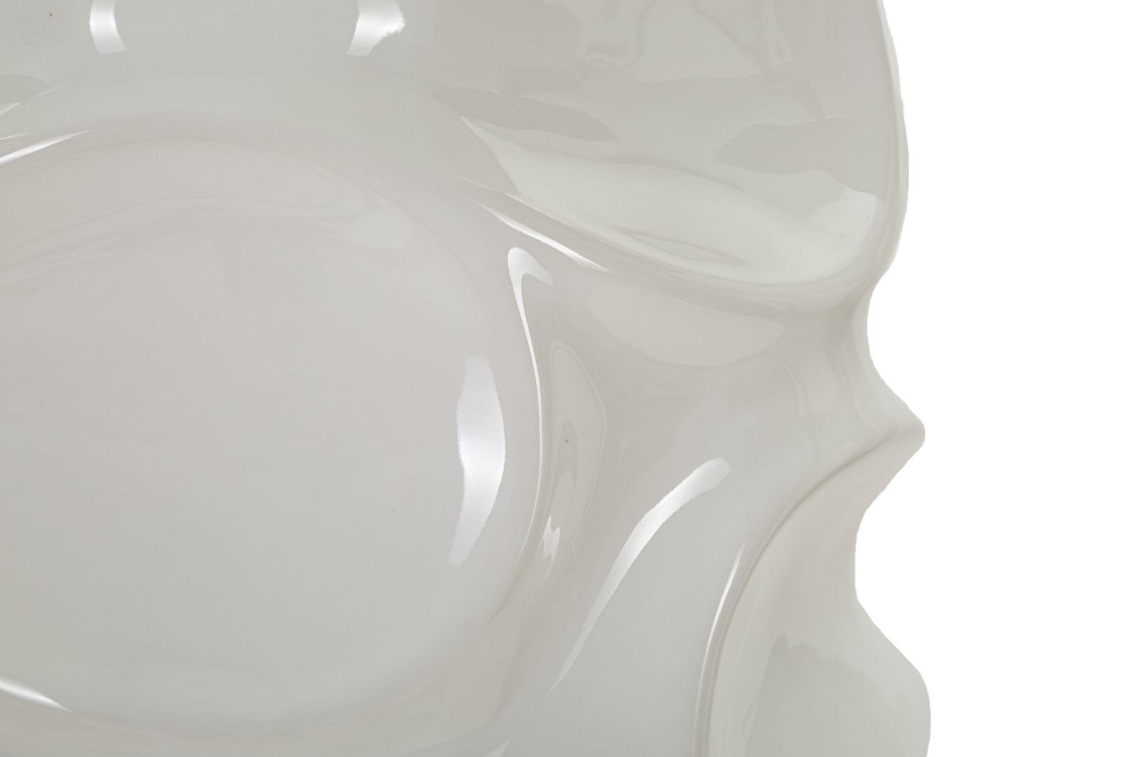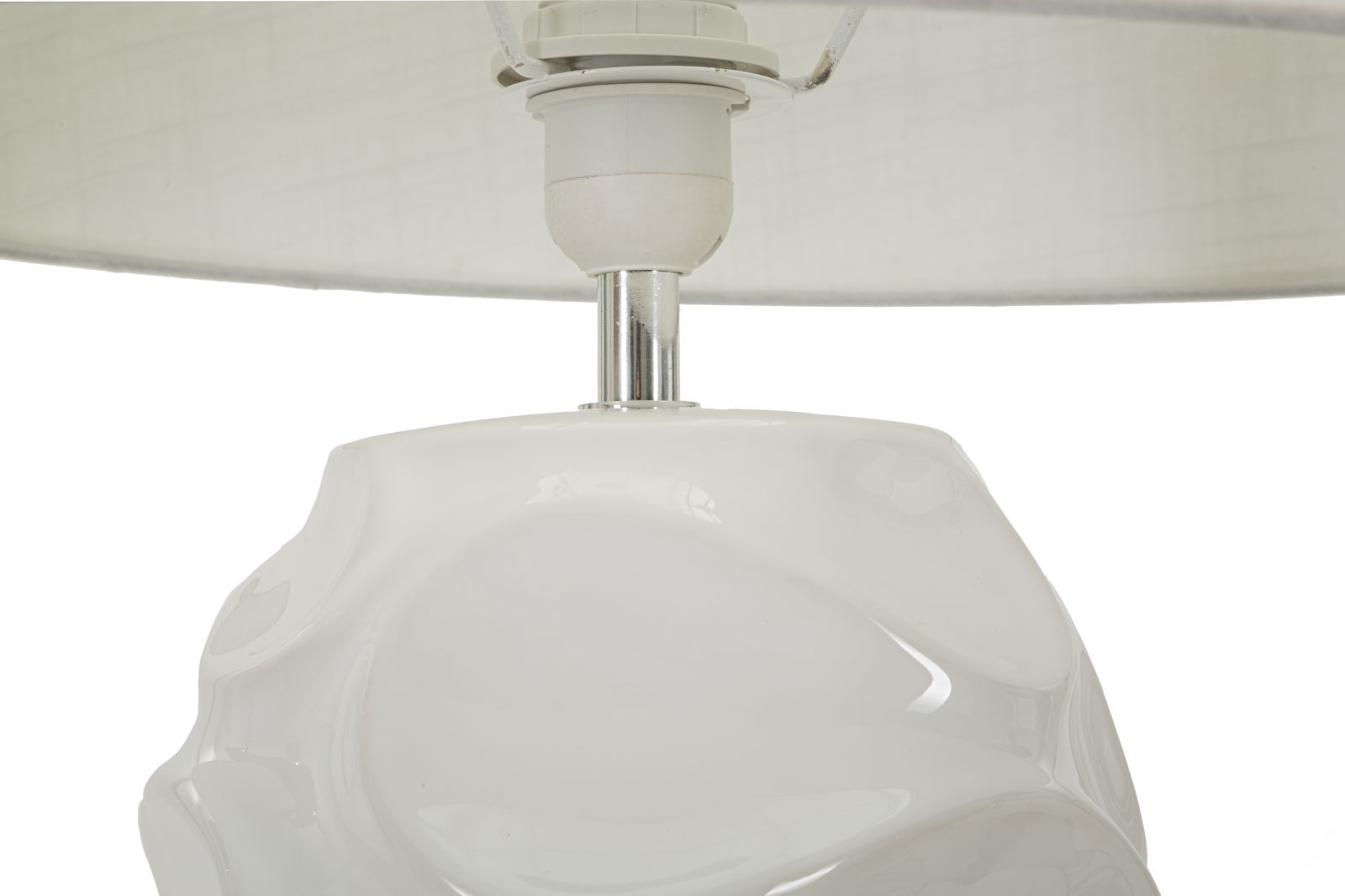 White ceramic lamp with soft and rounded shapes. Complete with white fabric lampshade.